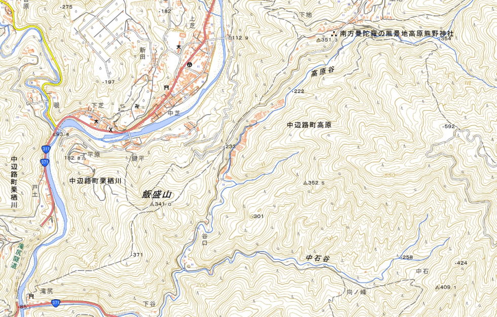 | 行程は図上のR311とR371分岐の滝尻BSから東北東に位置する熊野本宮大社迄 Map:Mapion |