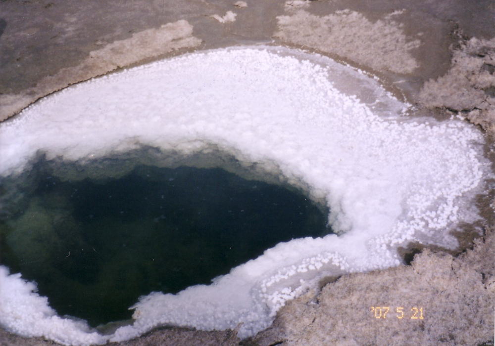 | E チャカ塩湖;海抜3104m、南北12Km、東西9Km トロッコに乗り湖の中へと行くことができる。スーパーにも並ぶ「海神」と呼ぶ塩。 |