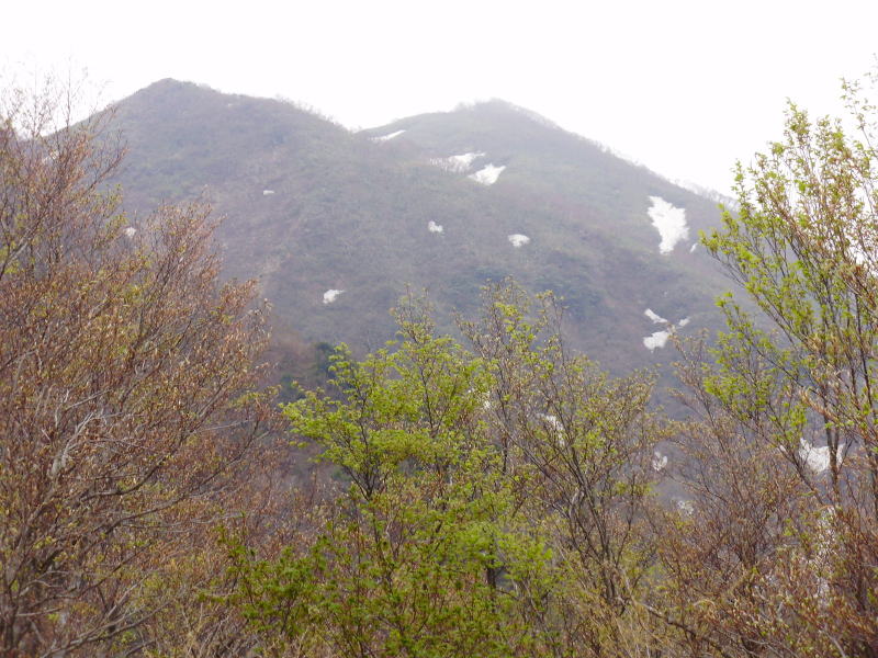 | <シャクナゲ平> スキー場から山頂までは約1200mの高低差があり、アップダウンが少なくひたすら上へ 上へと登る。木の階段が何度も続く、早朝出発の人が降りてくる、苦しい息づかいを聞い て声を掛ける人もいる。 急坂を数回登り、二時間半経ってシャクナゲ平に到着する。ここは小荒島岳への分岐に もなっている。昼食の時間だが山頂まで延ばすことにして、軽食を摂る。 先の方に三峰みたいな山稜が見え、標準の一時間で届くとは思えない。今日はピッチが 上がらずペースは遅い。 |