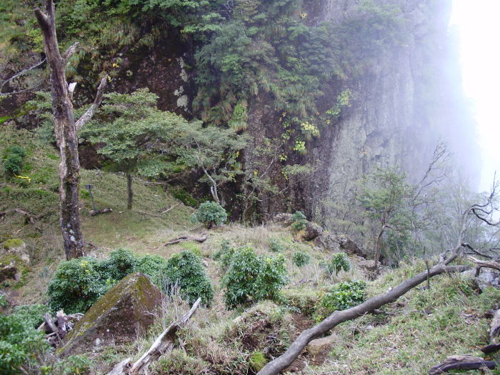 | <水場ルート;北〜南> 分岐を過ごして南下、目の前に大きな峰が現れる。この先が三ツ坊主の岩場らしい、ガス が覆い、眺望も期待できない天候、時間からはより安全な水場ルートを進む事にする。分岐 点には危険だよとの注意書き、内心を覗かれた感じだ。 大きな岩、コケの岩、倒木を何度も過ごし、谷川に着いた。水量は少ないが、そこから細い 流れに沿って上ると標識に水場とある。テープを頼りに上がると上の方から人の声、入山後 人の気配は初めてだ。 暫らくして後から声が掛かった、地元のグループが径や標の保守に 登山して来たとの事、程なく三ツ坊主ルートと合流した。 聞けば目の前のP1560をクリアーした先が山頂だと言う。 ピークからはハラッとする急坂、 ガスが断崖を遮り絵になる光景だが、鞍部に下りても山頂は見えない。 主峰を取り巻く岩 にはロープがあるが、難路が続く。 |