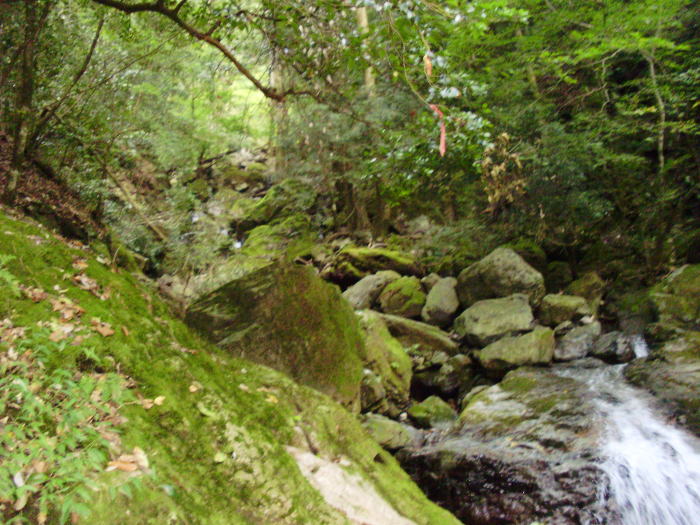 観音滝の上を渡渉 (滑りやすい岩肌) |