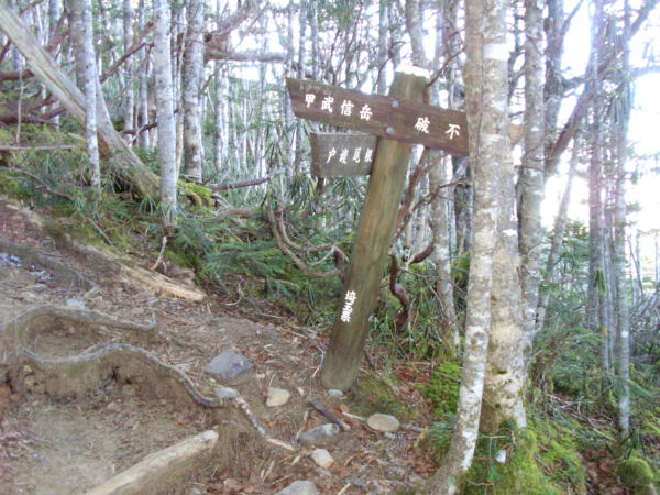 | <長い急登> 甲斐の国・山梨市からはどちらを見ても峰々が連なり、空きがない。高台にあるフルーツ園 に上がると前衛の山並みの上に富士山が現れる。笛吹川に沿って雁坂峠方面に進むと広瀬 ダムから西沢渓谷の入り口に至る。 カメラを担いだ人が多く、今年は不良の紅葉を渓谷に狙っているそだ。 3時間ほどで周回 できる径がある。 渓流に沿って進むとヌク沢から取り付く近丸新道の標識がある。 小屋からの指示は、その 先の徳ちゃん新道をとある。資料では小屋までの標高差1220mが5時間強とある、昼食や休 憩も加えると6時間の行程になる。更に20分程で山頂に上がり、1400mの標高差になった。 9時半に休業中の西沢山荘横の新道口へ、指示の理由は後で判明した。登りだけの行程は 50分歩いて、10分休むペースで急なジグザグ径を上がる。400mほど上った所で最初の休憩 を取る。 後ろからテントも担いだ人が追い抜いてゆく。 更に350mほど上り二度目の休憩、 この付近から石楠花の群生路となり、程なく近丸新道との合流地点に出合った。三度目は昼 食休憩を摂る。山荘横から3時間経過、2050m付近に至り、西には鋭い鶏冠尾根が迫る。 戸渡尾根を更に250mほど上がり四度目の休憩、石ころと木の根っこだらけの急坂になる。 コケや倒木なども混じり歩きにくく、お腹の調子もイマイチ、足も遅くなる。 我慢の為所かと ゆっくりと進んで漸く従走路に出合った。直ぐに木賊山・トクサヤマの三角点に着いて長い 尾根上りが終わる。 |