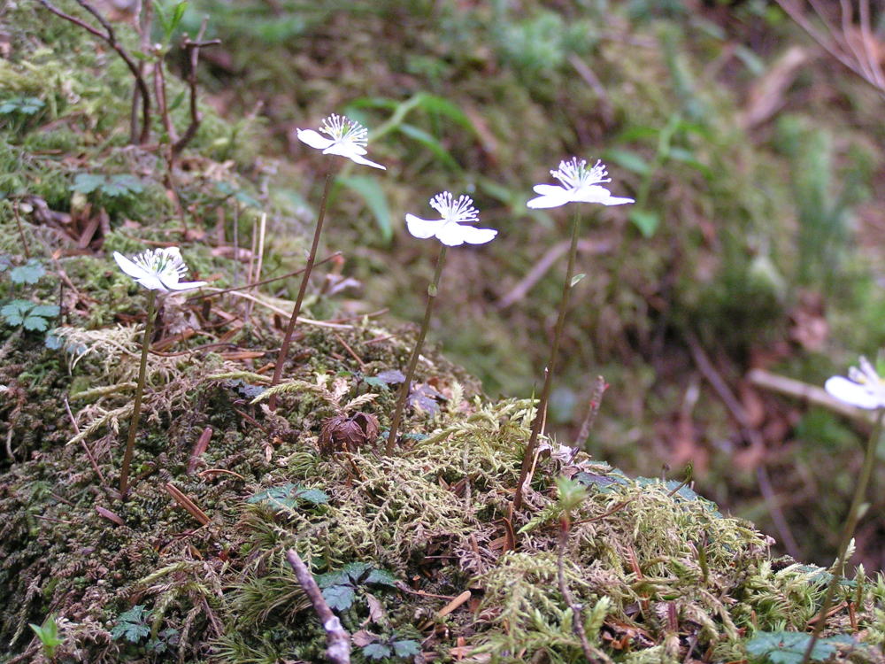 | <急登に高山植物> 神坂峠を早く発った折り返しの人も多くなり、径の状況を聞く。 1900m付近からは 急な坂になり、苔むした倒木も見られるようになる。 途中ではミツバオウレンが散見できたが、急登の付近からはバイカオウレンが密生 するようになり、カメラに納める。樹林の落ち葉や倒木から光に向かって白い花弁を 伸ばしている。ここまで径の脇にマイヅルソウ、ユキザサなども見れたが、緑陰の大 地に咲く可憐なオウレンの花は一幅の絵を観るようだった。 |