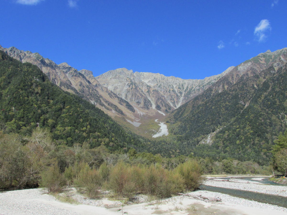 河童橋から見る穂高連峰 (右手奥に前穂、吊尾根、奥穂、ジャンダルムなどが見える)