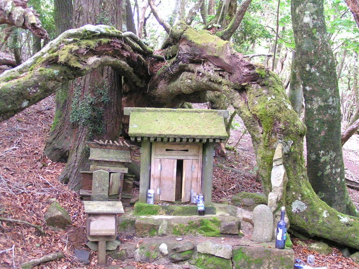 約90分上ると木の根っこの祭壇がある尾鈴神社に着いた。その奥が一等三角点の山頂で、