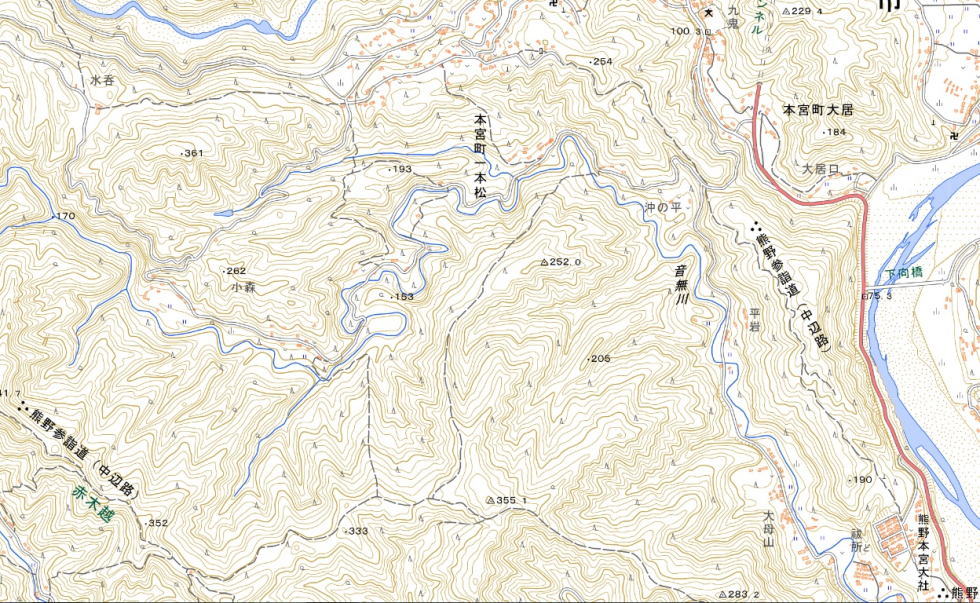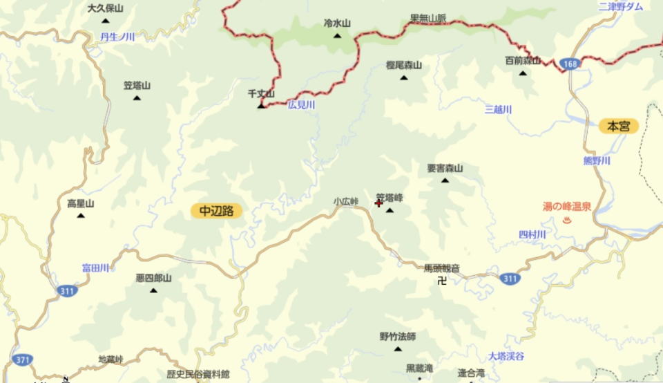 | 行程は図上のR311とR371分岐の滝尻BSから東北東に位置する熊野本宮大社迄 Map:Mapion |