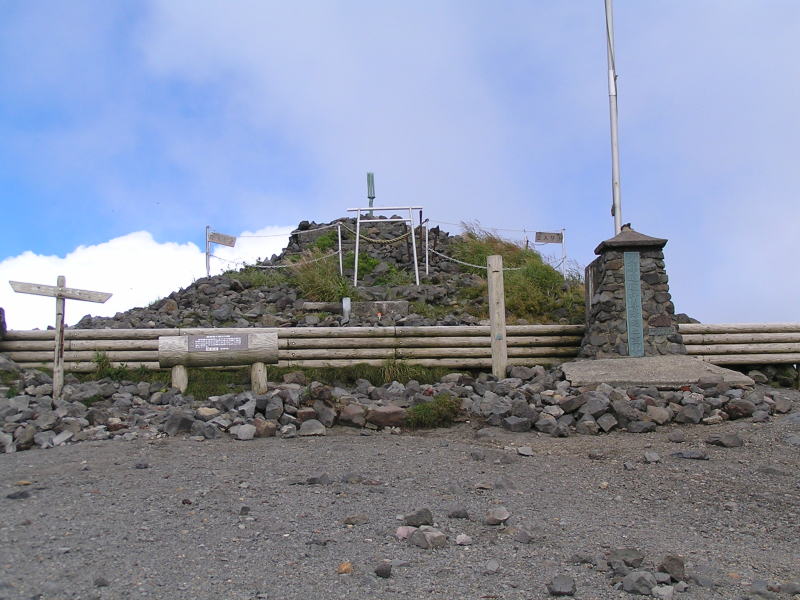 て山頂に到達、山小屋は閉鎖されている。 頂の鳥居の周りには30人程が腰を